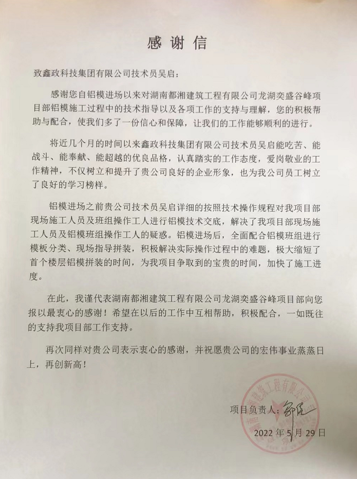 5月29日,都湘建工龍湖奕盛谷峰項目部向鑫政集團發來感謝信,高度贊揚鑫政工程服務人員在項目施工過程中服務專業而周到,極大地提升了項目首個樓層的鋁模拼裝效率,為后續工程的優質高效施工打下堅實基礎。