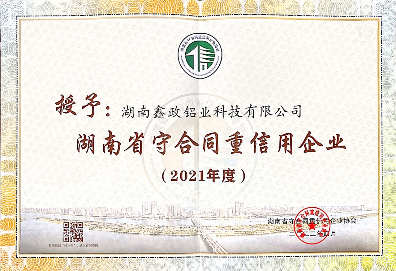 瀏覽次數:942近日,2021年度湖南省“守合同重信用企業”名單公布,湖南鑫政鋁業科技有限公司榮膺湖南省“守合同重信用企業”稱號。